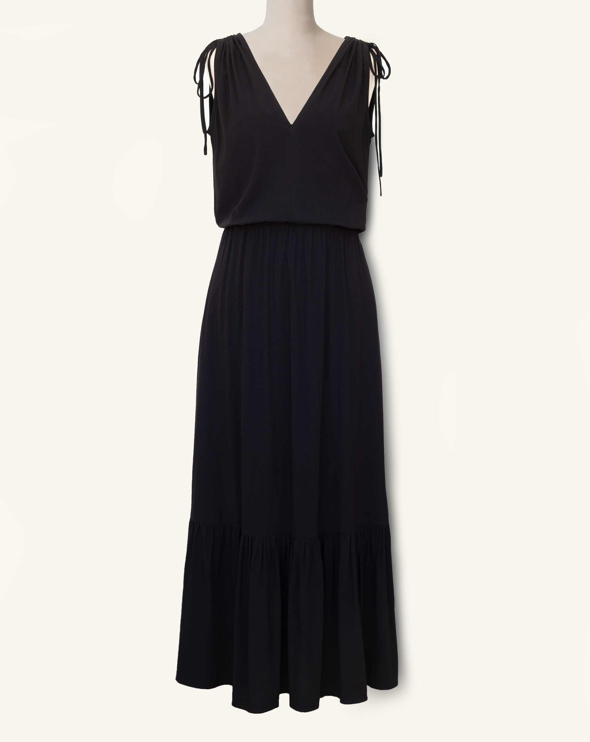 An elegant yet breezy maxi dress, made of printed viscose and with shoulder gathering details.