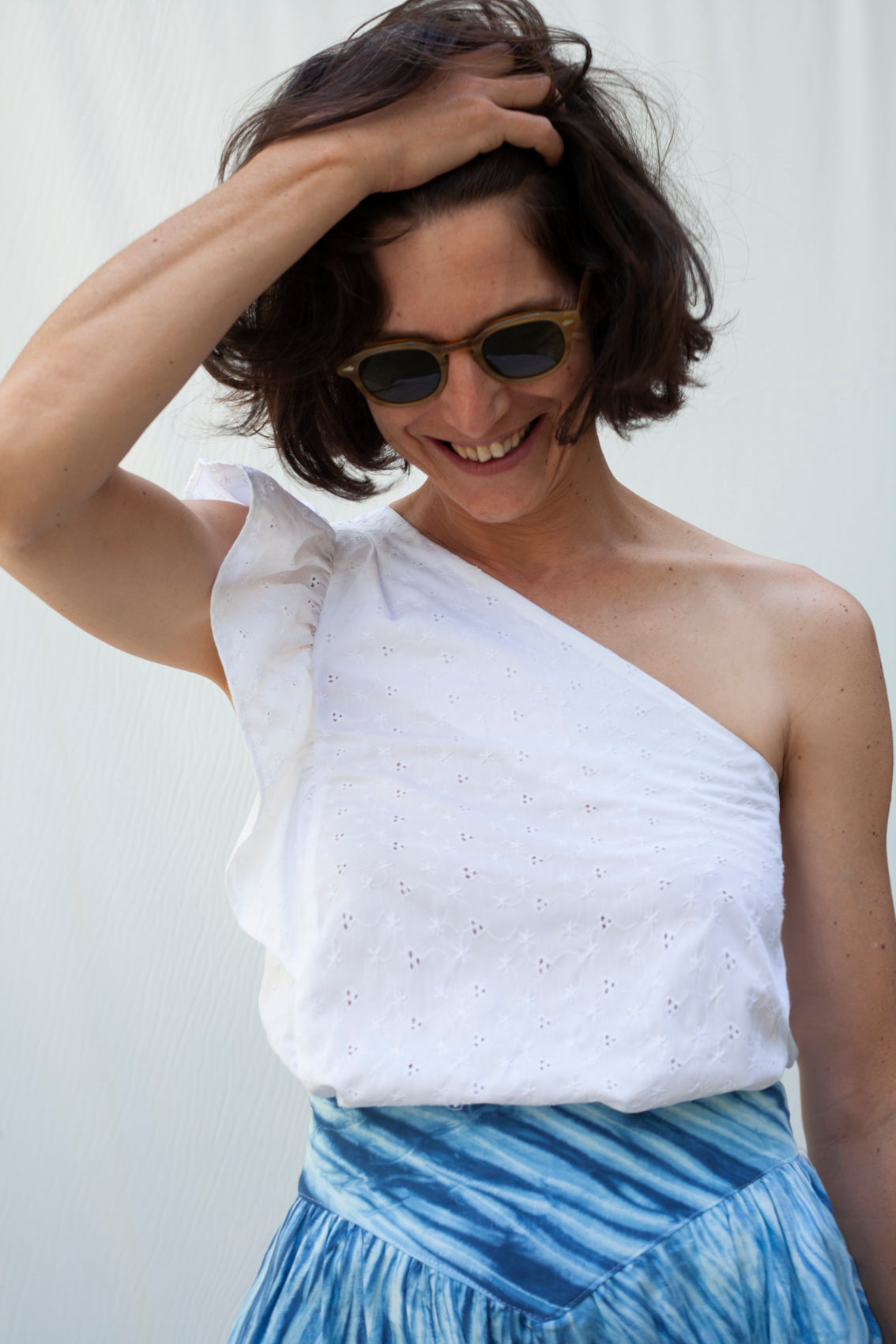 A classic one shoulder top with clean lines and a ruffle shoulder detail, easy to dress up or down. We love to pair it with our Coco Skirt or our Anis Pants.