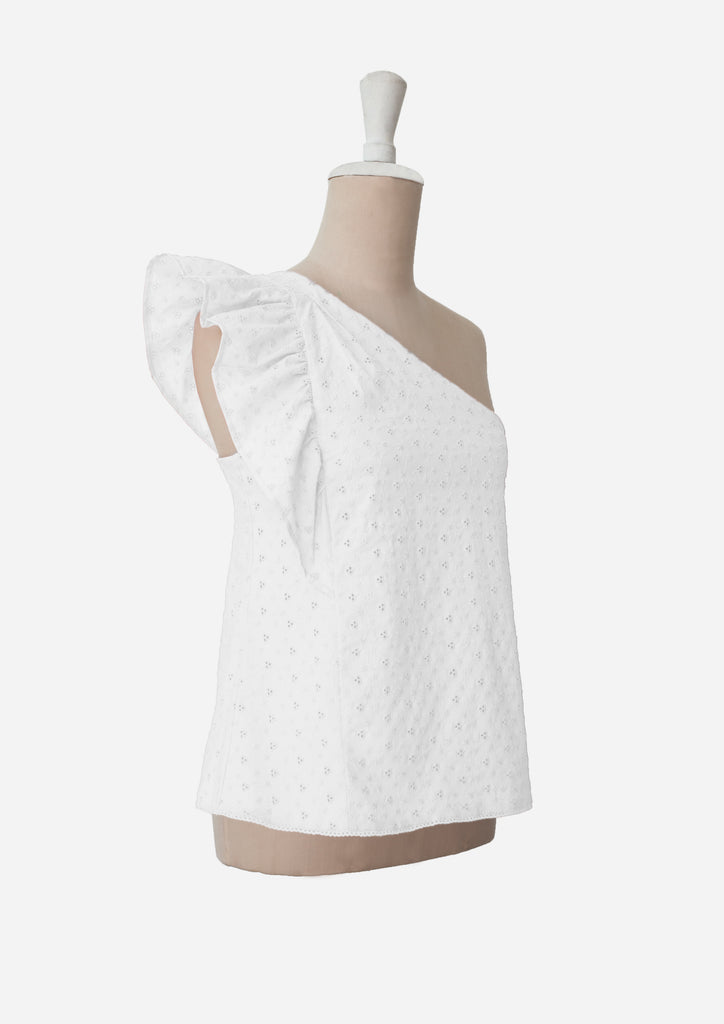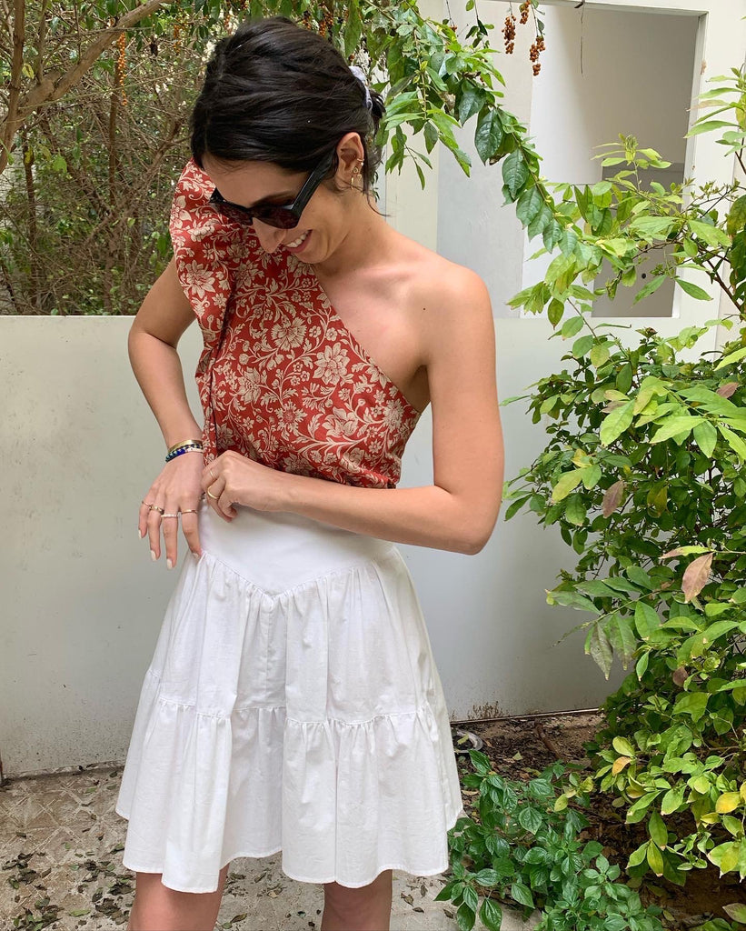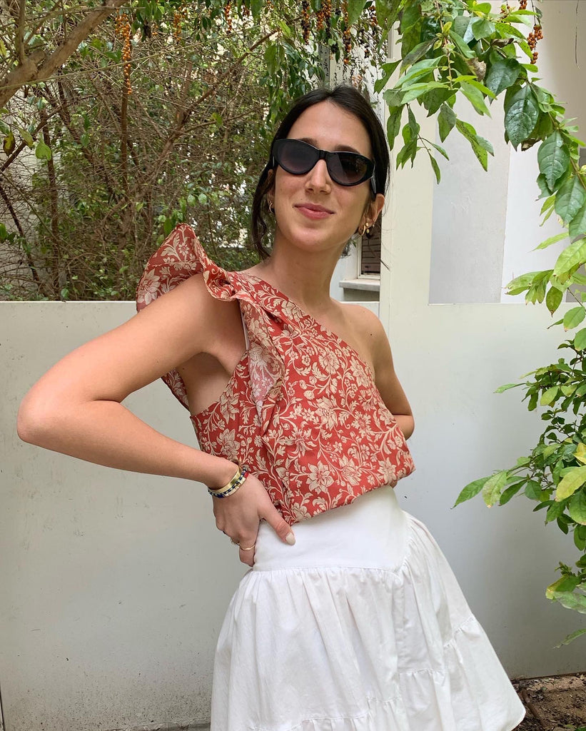 A classic one shoulder top with clean lines and a ruffle shoulder detail, easy to dress up or down. We love to pair it with our Coco Skirt or our Anis Pants.