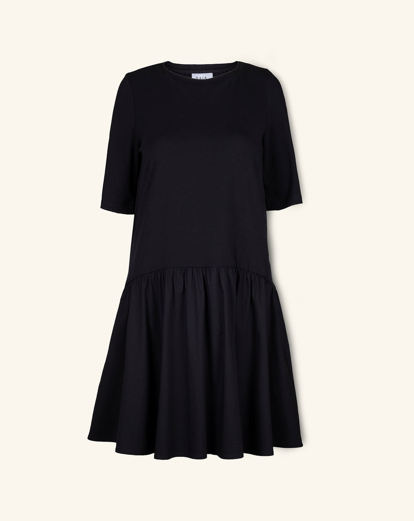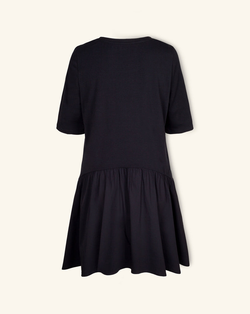 A classic T-shirt dress with a gathered drop-waist skirt. Endlessly wearable, it's our favorite thing to throw on and start the day with.