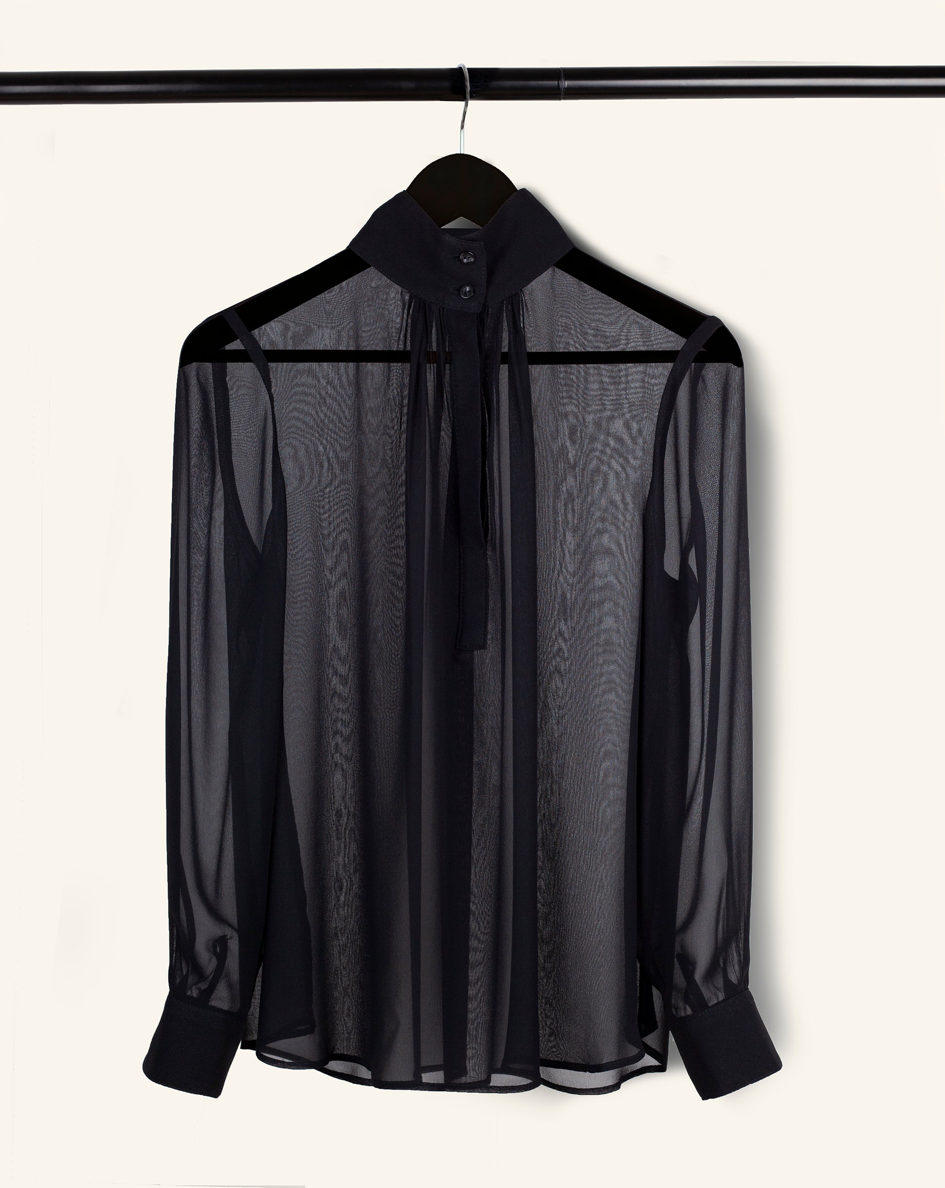 Our new classic Smith b;ouse in sheer black silk. Wear it over a black tank or your favorite bralette, and pair it either with jeans or with our Francis pants for an elegant look.